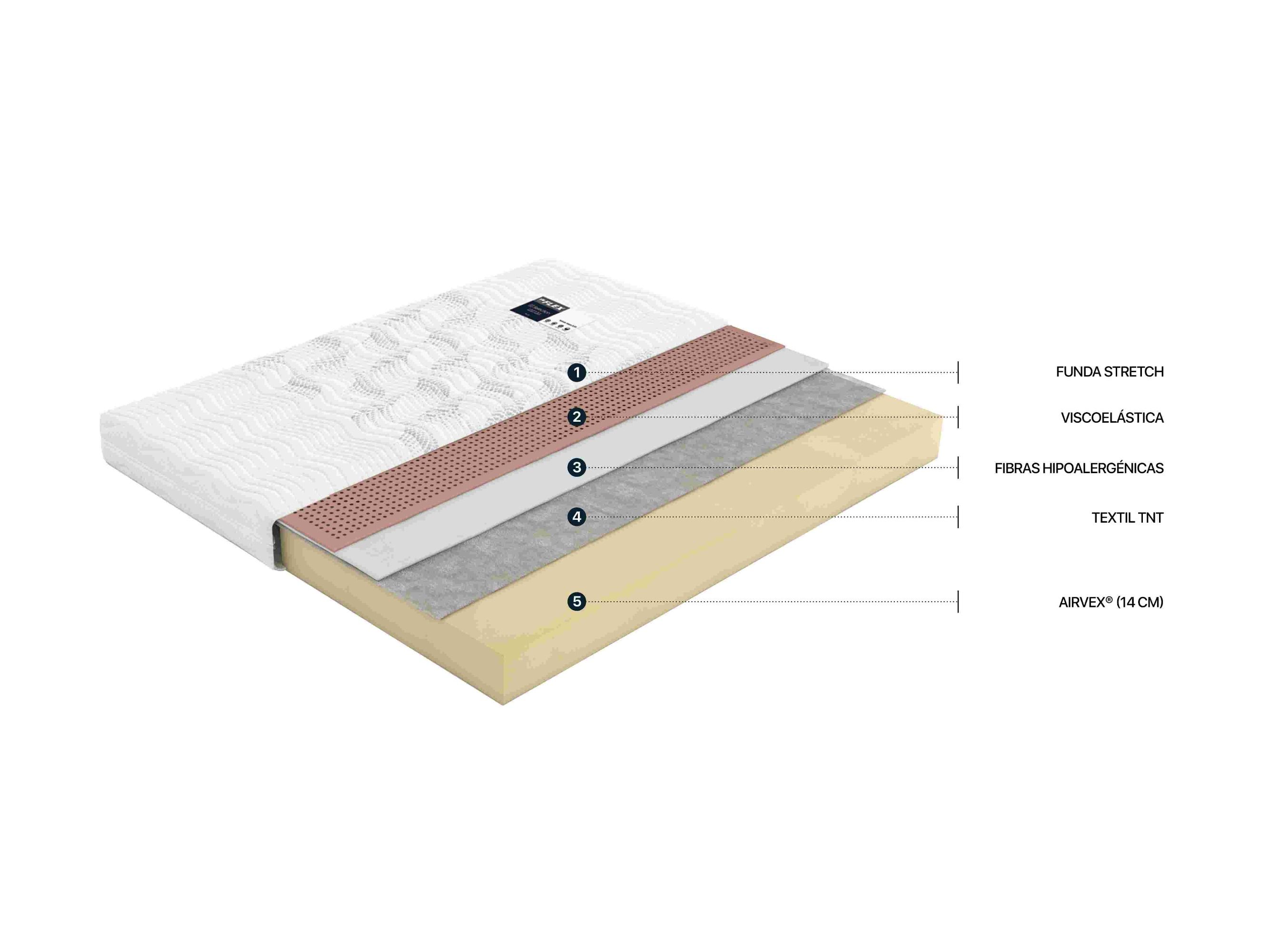 El colchón Teknia Visco está compuesto por un bloque de HR de célula abierta que permite la circulación del aire. Este material de alta densidad nos ofrece un excelente comportamiento en cuanto a resistencia y durabilidad, además una adaptabilidad perfecta. Cuenta con una acolchado con viscoelástica que nos proporciona una perfecta adaptación, cediendo únicamente donde se ejerce presión.