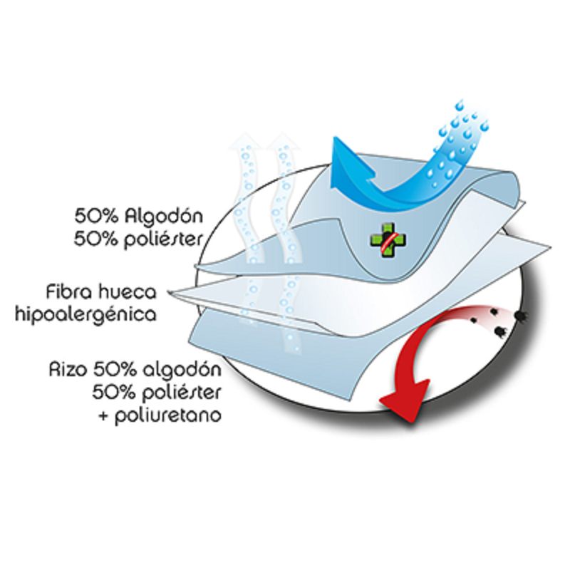 Su tejido superior es 50% algodón y 50% poliéster con tratamiento Sanitized®, el cual se aplica sobre la superficie del tejido para crear una barrera antiácaros, antibacterias y antihongos muy efectiva.